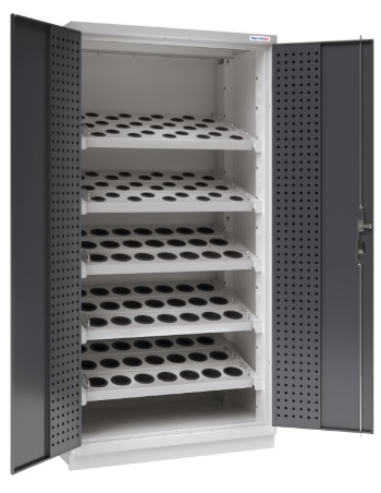 Корпус шкафа выполнен из стали толщиной 1,2-1,5мм., полка - из оцинкованной стали толщиной 1,0 мм., кассеты для хранения станочной оснастки - 1,2-1,5 мм.