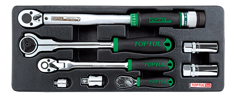 Набор трещоток 1/4", 3/8", 1/2", динамометрический ключ 3/8" 20-110 Нм, переходники и свечные головки, 8 предметов в ложементе (B) TOPTUL купить в Ярославле и других городах России