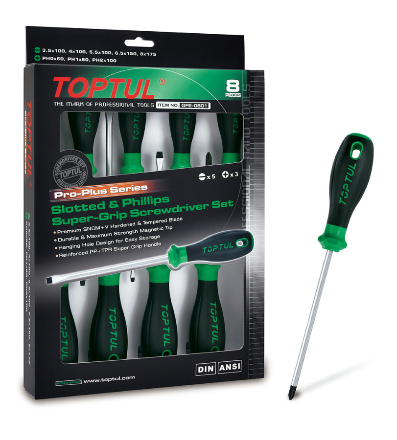 Приобрести Набор отверток (крест и шлиц) в картоне 8 пр. серии Pro-Plus TOPTUL от компании Toptul (Тайвань) из раздела Наборы отверток по цене 2 874 рублей.